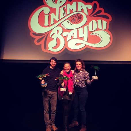 Les réalisateurs Félix Lamarche, Alexandra Guité et Maryse Goudreau sur la scène du Acadiana Center for the Arts de Lafayette pour recevoir leur prix.