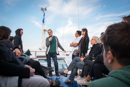 Le cinéaste acadien Phil Comeau; président du jury donnant une classe de cinéma en mer lors de la Ciné-Croisière du 10e Festival Les Percéides en août 2018.